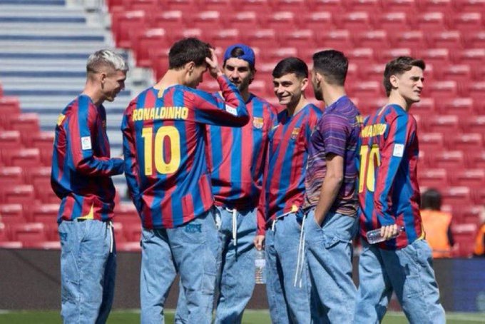 Oficjalne konto FC Barcelony opublikowało wideo, na którym zawodnicy trzymają koszulkę z nazwiskiem Ronaldinho i legendarnym numerem 10. To jednak był dopiero początek celebracji.