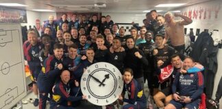 Gwiazdy Arsenalu pozują z wielkim zegarem w szatni po zwycięstwie 3:0...